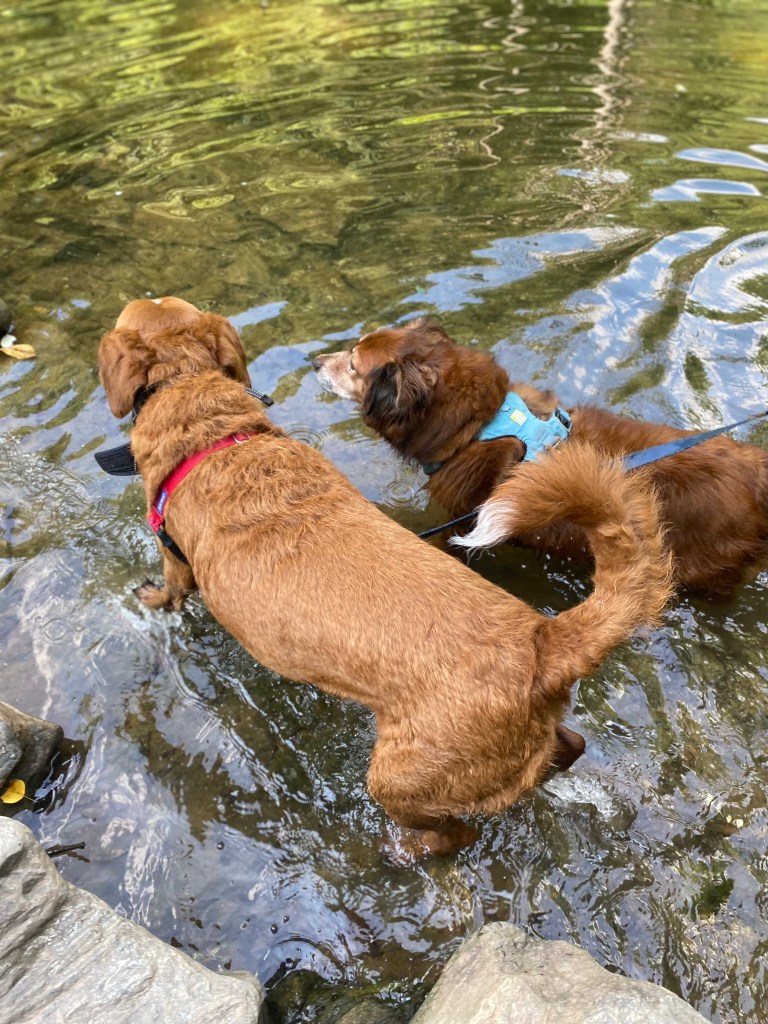 We carefully descended on a hill, bringing us to a fork in the trail. Making a left, we reached the second half of our hike – the portion that guided us along a creek. With the sun becoming stronger it was the perfect trail to be on as it allowed us to break in little streams the boys could dip their paws in.